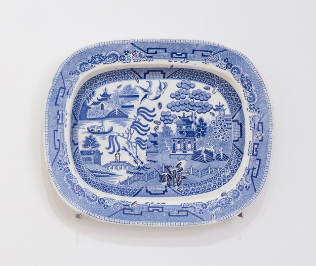 Transfer print collage on erased willow pattern platter by Wallace & Co.