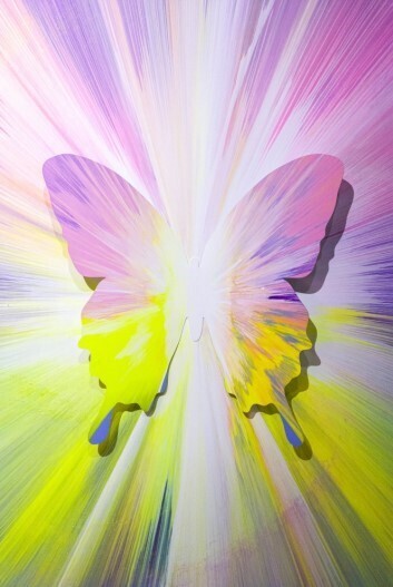 Acrylic and diamond dust on stretched canvas with aluminum butterfly, 36 × 36 in...