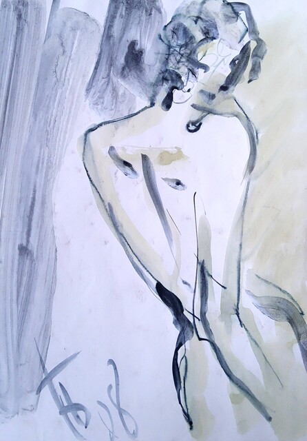 Natalia Bazhenova, "Silent Contemplation", figurative painting, female nude art, minimalist figure painting, contemporary figurative art, modern nude artwork, expressive line art, abstract figurative painting, feminine form painting, emotional figure art