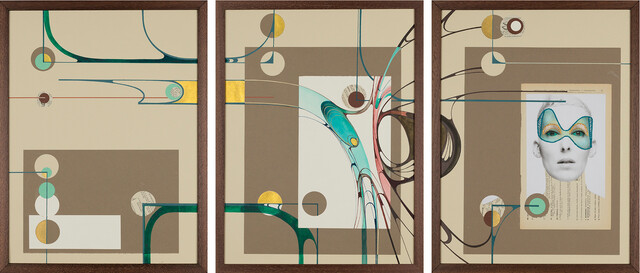 Mixed media on paper. Tryptich, 15 7/10 × 35 2/5 in...