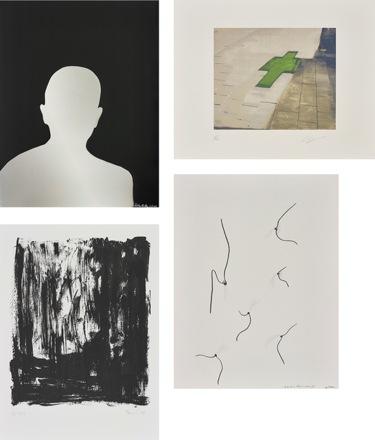 The complete set of four prints, including two lithographs and two screenprints in colours, one with silver mylar collage, on various papers, the full sheets and with full margins, the sheets loose (as issued) contained in the original card portfolio with fabric-covered corners and spine.