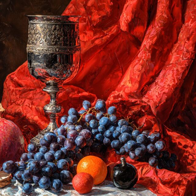 Saskia Rem Brandt, "Ritual in Red", baroque inspired art, silver chalice painting, red drapery artwork, luxury classical painting, grapes still life, fine art realism, museum quality still life (2025)