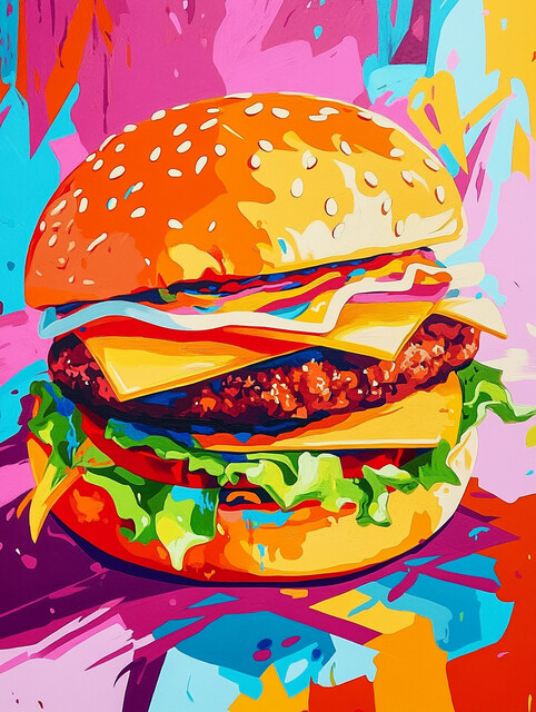Title: Neo Bauchaus, “Burger Icon – Contemporary Pop Art Food Painting”, pop art burger, burger painting, pop art food art, fast food artwork, modern food painting, burger wall art, urban pop art, modern kitchen wall art, restaurant wall decor, fast food pop