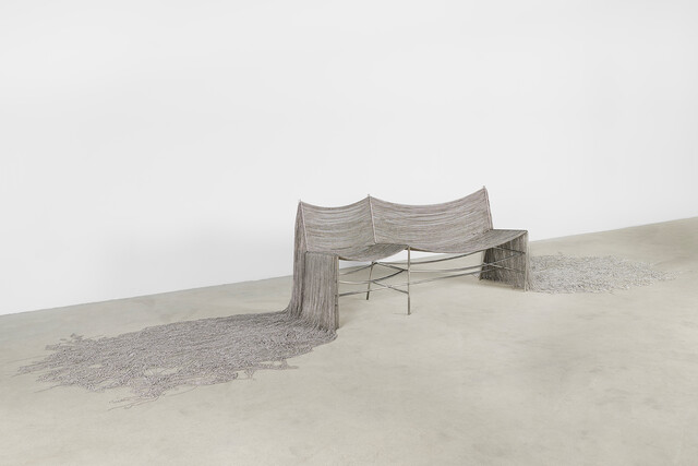 Stainless steel, nickel-finished ball chains, 83 × 432 × 96 cm.