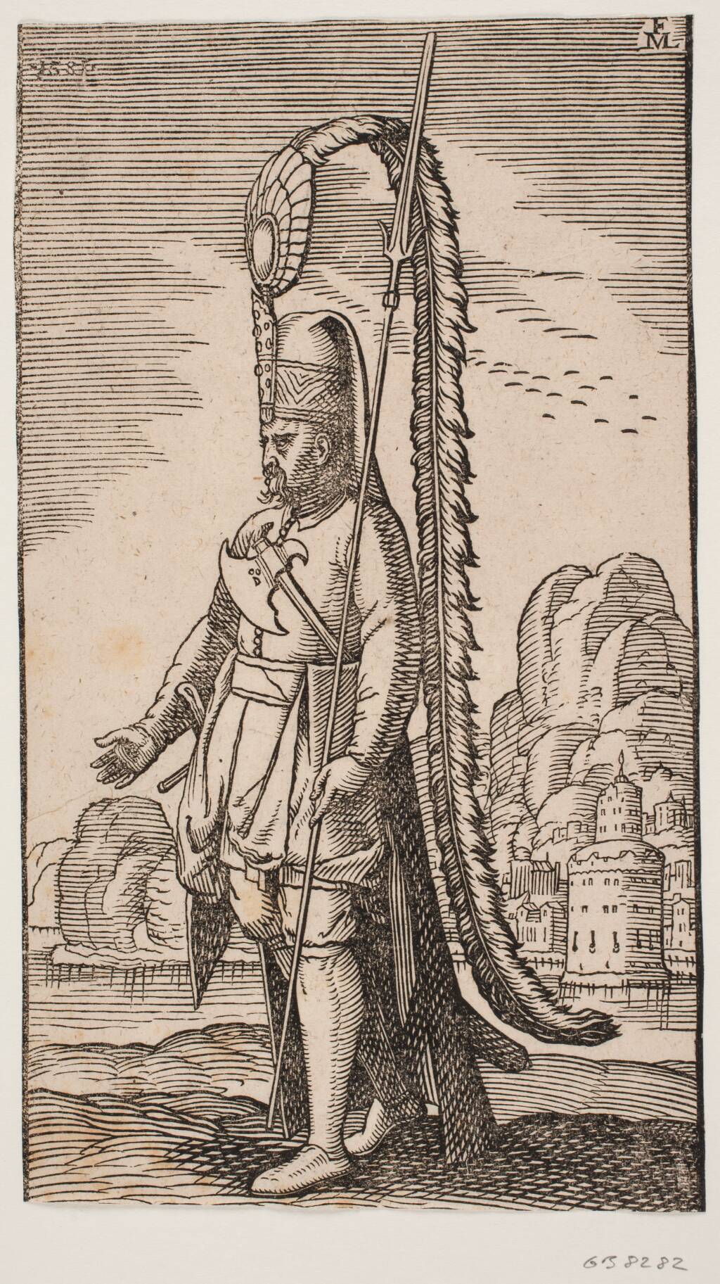 Title: Stående soldat ved en klippekyst, hinsides vandet en by; hans hovedbeklædning er smykket med en ekstremt lang fjerprydelse