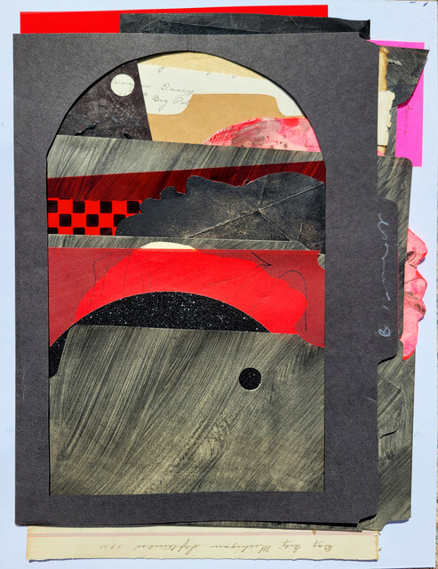 Mixed media collage on file folder, 28 × 21 1/2 in...
