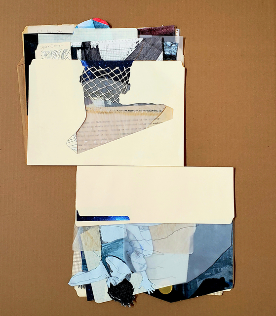 Mixed media collage on file folder, 28 × 21 1/2 in...