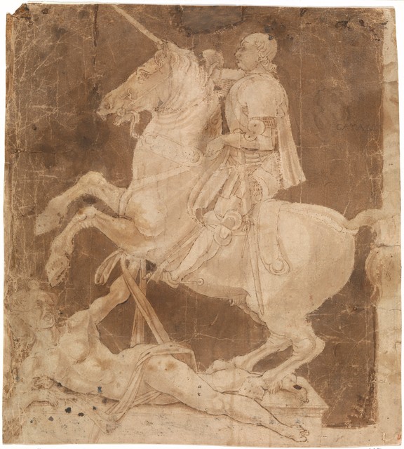 Pen and brown ink, light and dark brown wash; outlines of the horse and rider pricked for transfer.