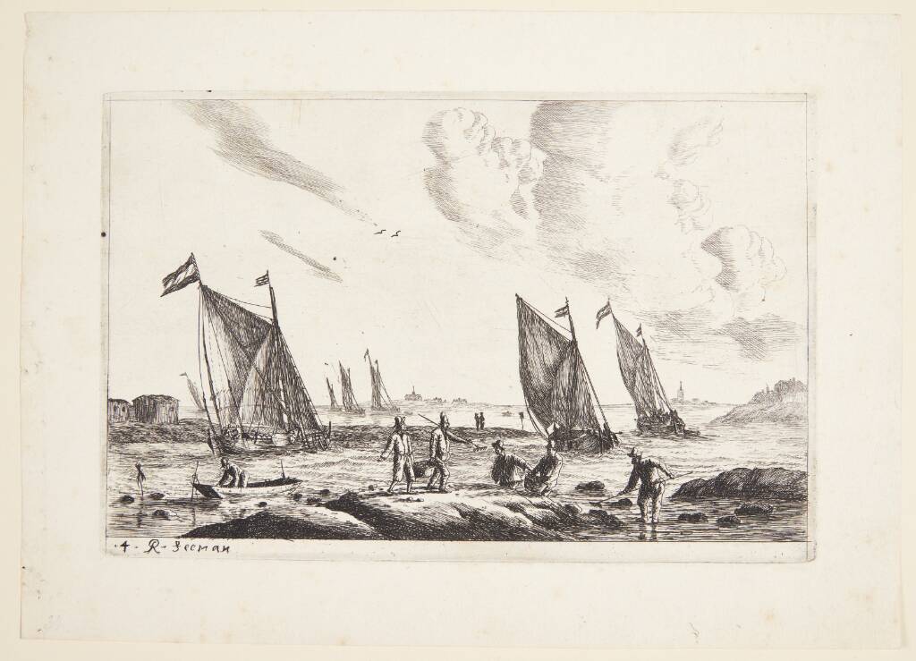 Neapolitanske fiskerdrenge som spiller kort. Flere fiskere er beskæftiget med deres net. I baggrunden ses Capri