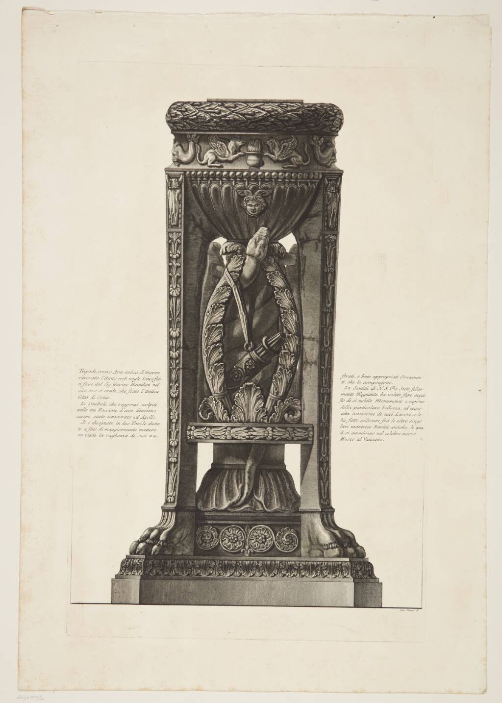 Marble tripod or altar found at Ostia by Gavin Hamilton in 1775, from "Vasi, candelabri, cippi, sarcofagi, tripodi, lucerne, ed ornamenti antichi disegnati ed incisi dal Cav. Gio. Batt. Piranesi, Vol. I" (Vases, candelabra, grave stones, sarcophagi, tripo