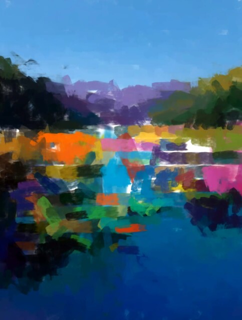 Irina Fedorova, “Blue Reflection Landscape — Abstract River Painting”, blue abstract art, modern landscape art, abstract river painting, contemporary landscape painting, abstract nature painting, blue wall art (2024)