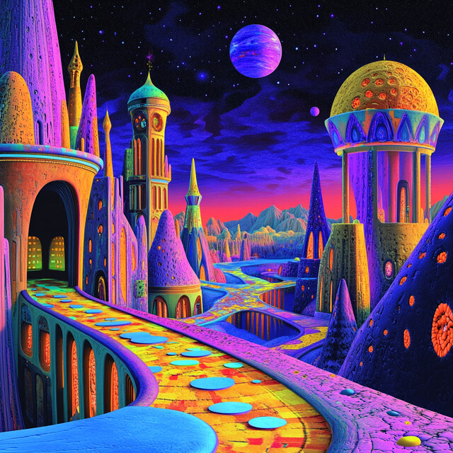 Elias Soederberg, "Cosmic Harmony of a Distant Future III", futurism, futuristic landscape, cosmic art, space, sci-fi, surreal landscape, utopian vision, abstract landscape, digital aesthetics, vibrant colors, imaginary world, dreamlike, modern art, cont