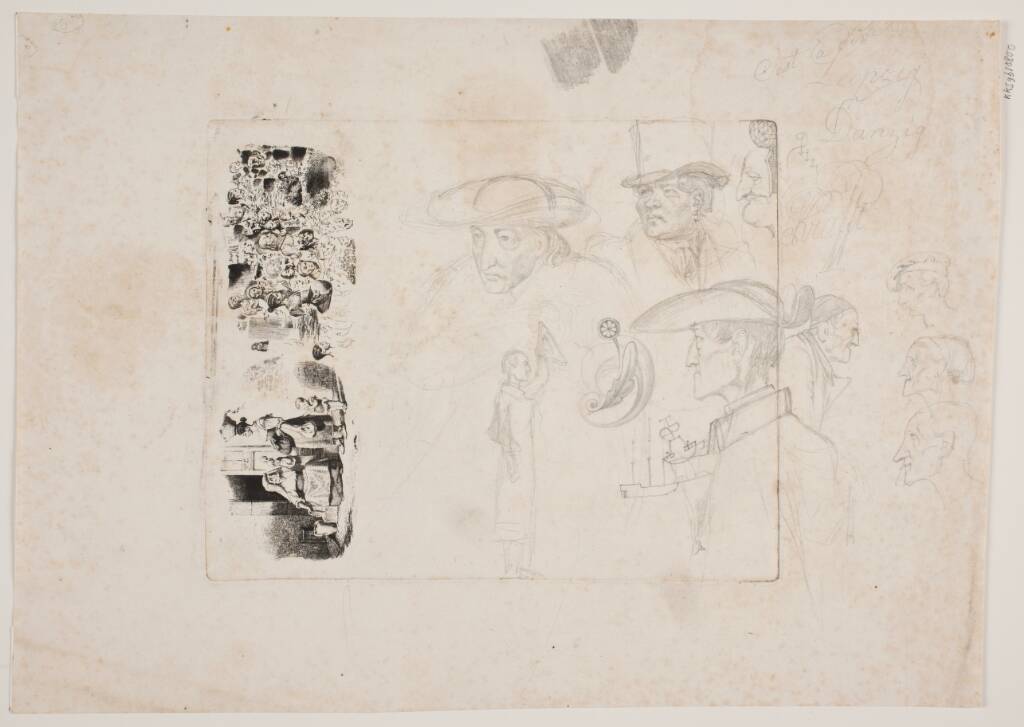 Title: Prøveblad med italienerinde siddende i en døråbning; ansigtsstudier; samt blyantstudier af hoveder