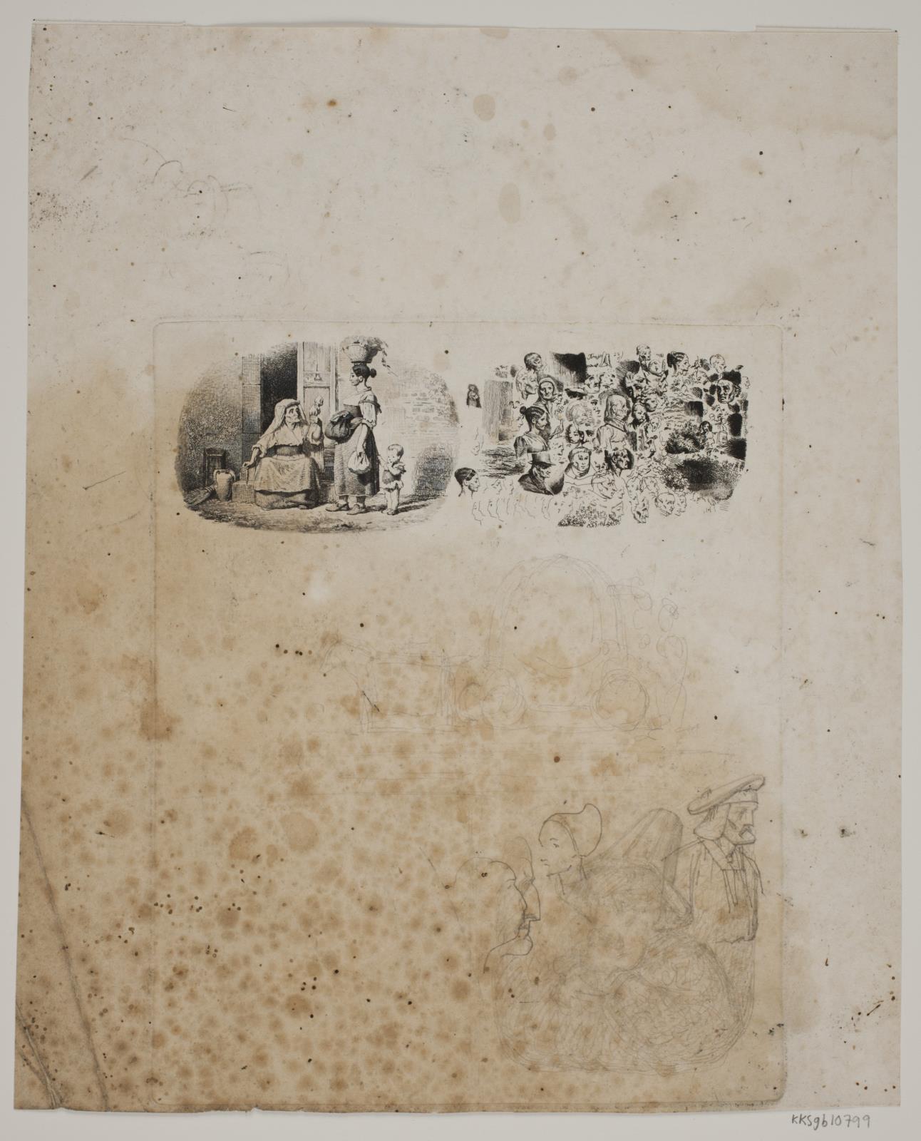 Title: Prøveblad med italienerinde siddende ved siden af kvinde og dreng og blyantstudier