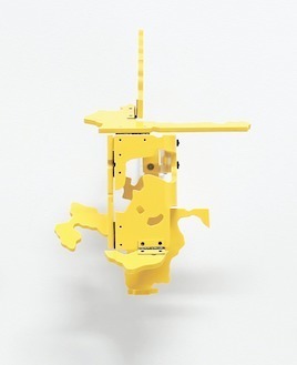 Compressed PVC, sheet metal, steel, hinges, rotating elements, 13 × 10 × 8 cm.
