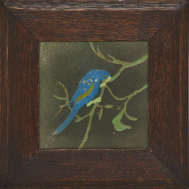 Van Briggle, Tile with parrot on branch (framed), Colorado Springs, CO (1910s-20s)