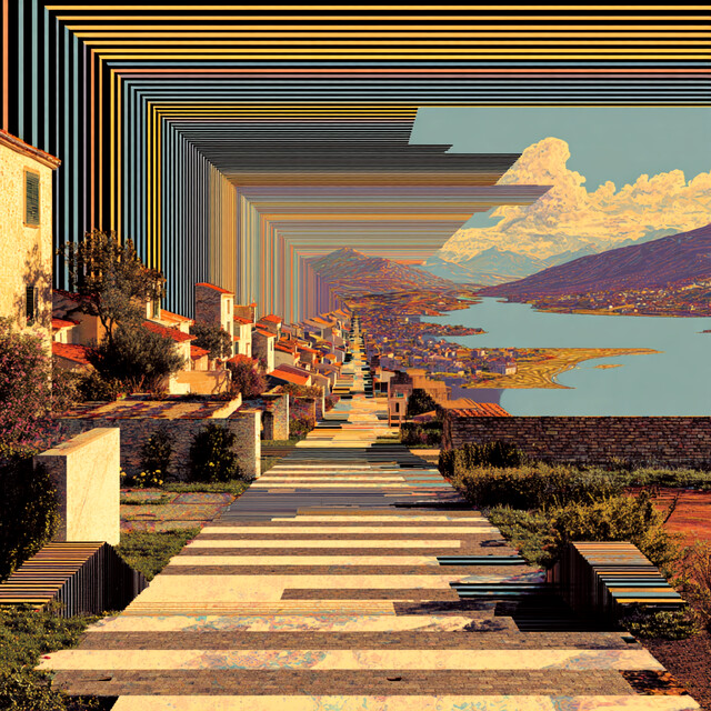 Title: Neo Bauchaus, “Architectural Horizon: Mediterranean Perspective”, XXL Art, architectural landscape painting, mediterranean cityscape, perspective artwork, geometric perspective art, conceptual landscape, contemporary architecture art, modern coastal land