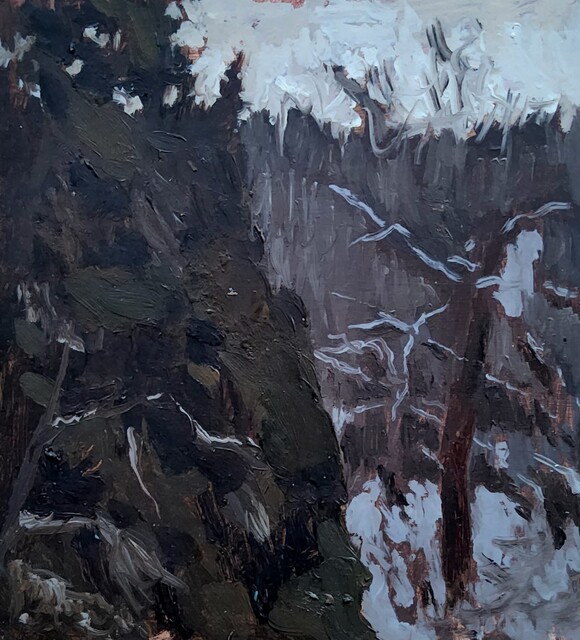 Kirill Solovitskii, “Flight Above Snow — Atmospheric Winter Forest Painting”, winter landscape painting, snowy forest art, expressionist landscape art, contemporary nature painting, birds in flight artwork, moody woodland painting, atmospheric winter art