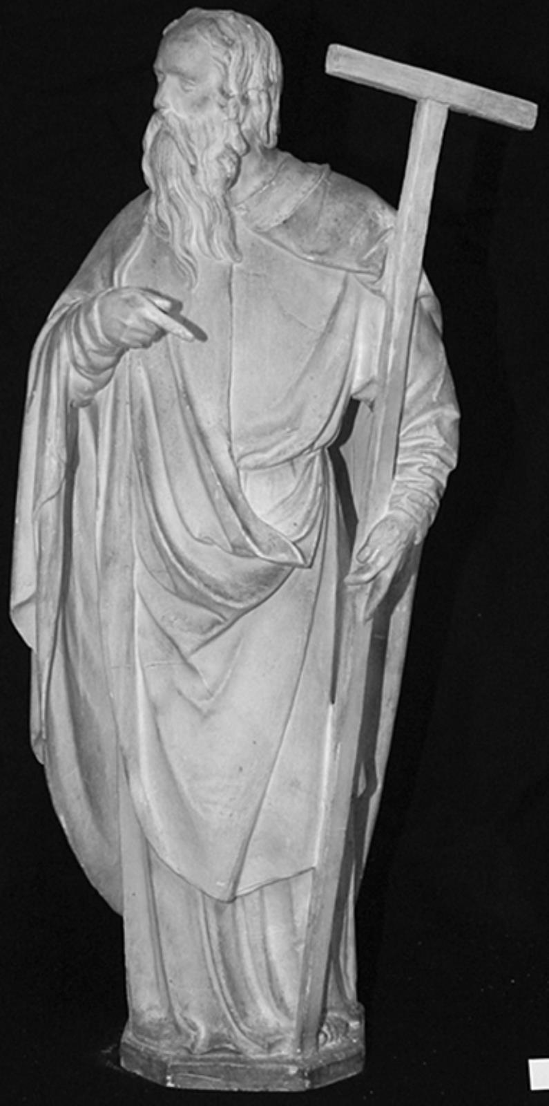 Title: Apostlen Phillip med T-formet kors i v. hånd. 14 statuetter fra St. Sebaldus kirken, Nürnberg, helgenskrin: de 12 apostle, samt portræt af Peter Vischer og St. Sebaldus