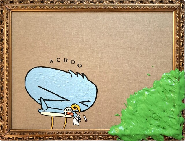 Felix Weisz, "BLESS YOU", contemporary art, figurative art, cartoon art, pop surrealism, humorous art, modern illustration, playful art, character art, mixed media, conceptual art, ironic art, whimsical art, graphic style, modern painting, statement art,