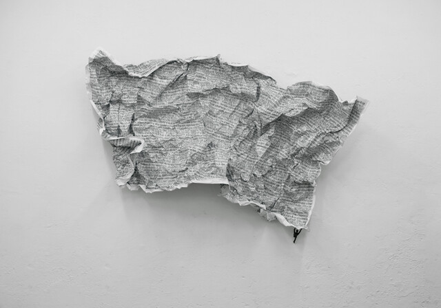 Bronze figure and printed vinyl on aluminum foil, 300 × 150 × 2 cm.