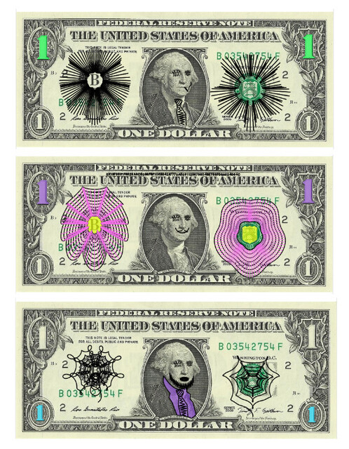 Set of 3 physical pen plotted dollar bills representing 3 unique generative outputs, 12 × 12 × 1 in.