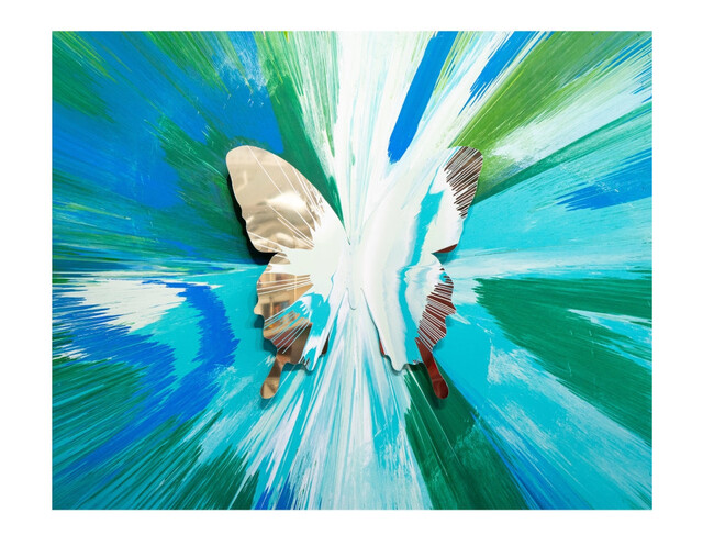 Acrylic on canvas, gold mirrored butterfly, 48 × 60 in.