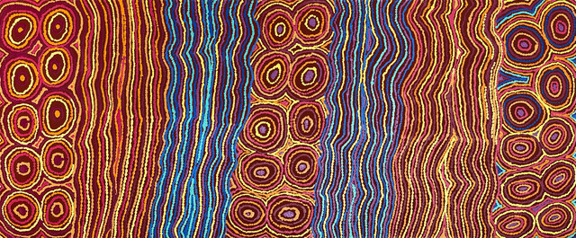 A Central and Western Desert style acrylic on canvas painting that utilises the dot method which was brought to the attention of the wider public through the circulation of artwork...