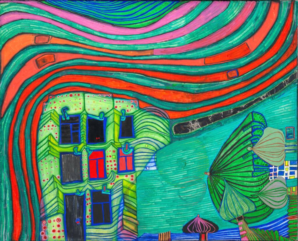 Tall, slender trees bow in a rightward wind as if they were blades of grass in this monochromatic ink drawing. Only a cluster of tiny human figures carrying bundles suggests their ...
