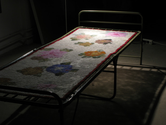 Artist's used sweater, woolen underpants, hat, gloves, steel cot, video player, 300 × 400 × 300 cm