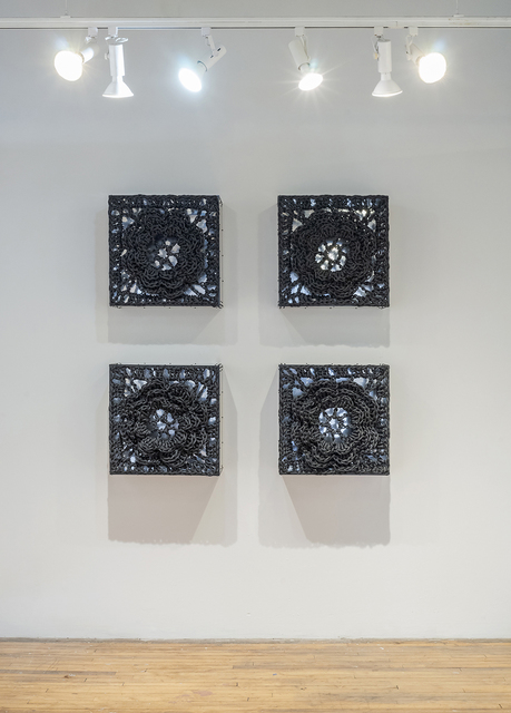 Crochet rope, aluminum, plaxiglass, wood, 22 × 22 × 12 in.