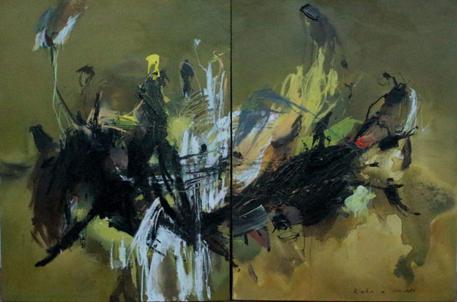 Rust dyeing, natural dyes, acrylic paints, oil pastels on canvas., 130 × 250 × 4 cm...