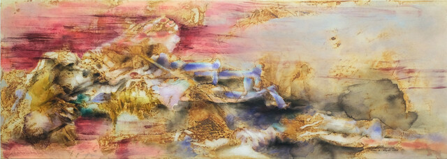 Rust dyeing, natural dyes, acrylic paints, oil pastels on canvas., 130 × 250 × 4 cm...