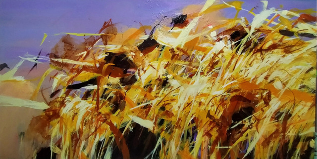 Rust dyeing, natural dyes, acrylic paints, oil pastels on canvas., 130 × 250 × 4 cm