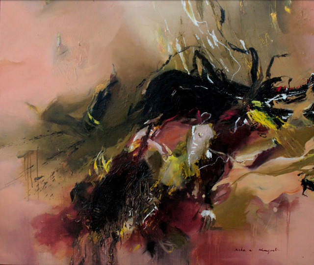 Rust dyeing, natural dyes, acrylic paint, oil paste, charcoal, glass pencil on canvas., 49 × 41 × 4 cm...