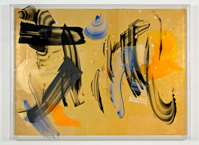 Acrylic paint on three acrylic panels, metal gilding, 36 × 48 × 4 in.