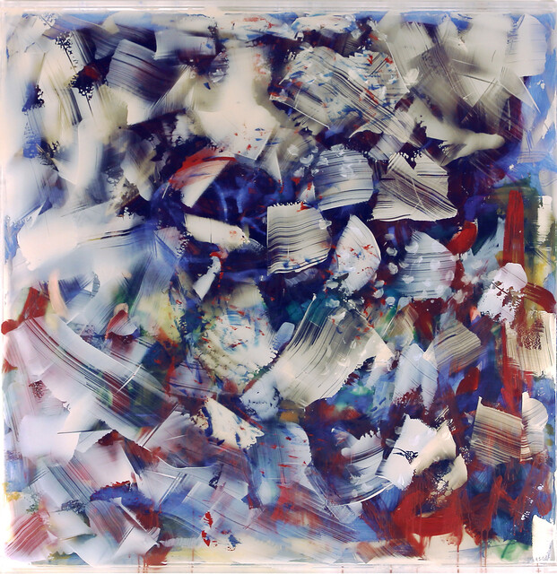 Acrylic paint, oil stick, on acrylic resin, 48 × 48 in...