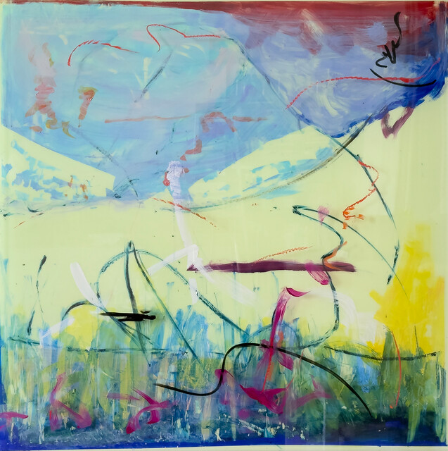 Acrylic paint, oil stick, on acrylic resin, 48 × 48 in...
