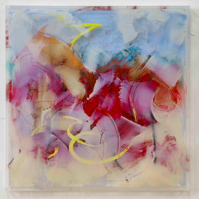 Acrylic paint, oil stick, on acrylic resin, 48 × 48 in...