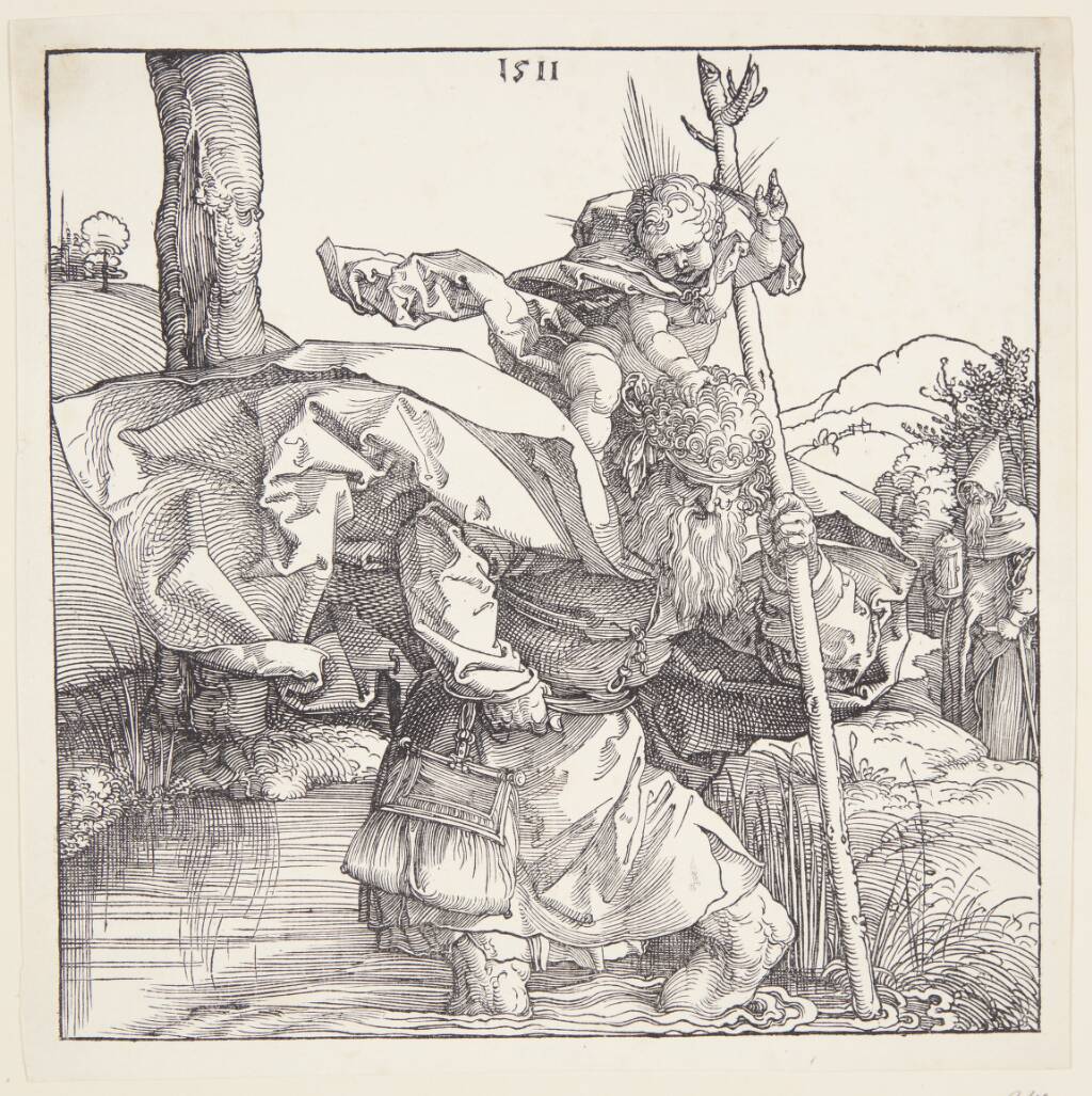 Legend has it that the giant Christopher carried the Christ Child across a river, but the weight became almost too much for him: this was because the child was carrying all the sin...