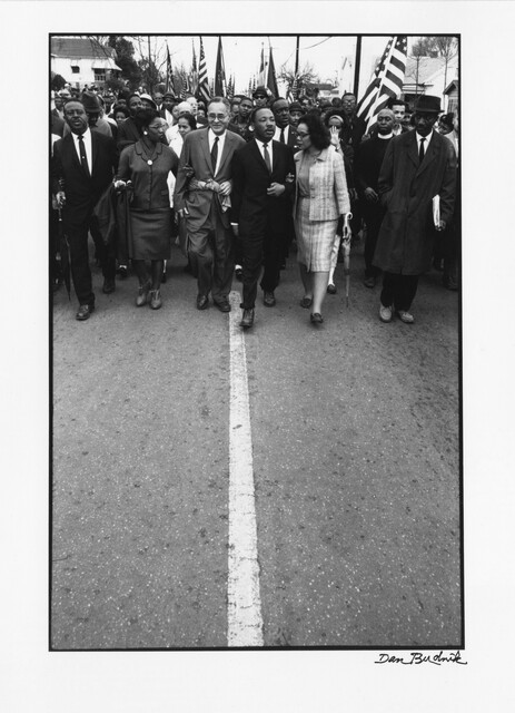 Title: Dan Budnik, Selma to Montgomery March, Triumphant Civil Rights leaders entering Montgomery on Oak Street: L to R - Ralph and Juanita Abernathy, Ralph Bunche, Martin Luther King Jr. and Coretta Scott King, with Frederick Reese, 25 March 1965 (1965)