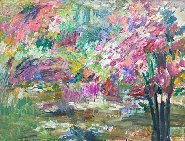 The intense color and shading in undulating bands convey a lushness and musical resonance that together define a highly innovative approach to landscape painting. The artist’s insc...