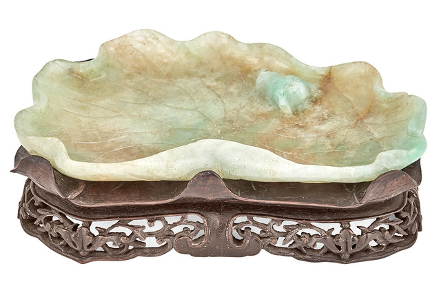 The unfurled lotus leaf form with a small three-legged toad resting on the surface, the stone a celadon gray with bright green and chestnut inclusions, fitted wood stand., 6 in