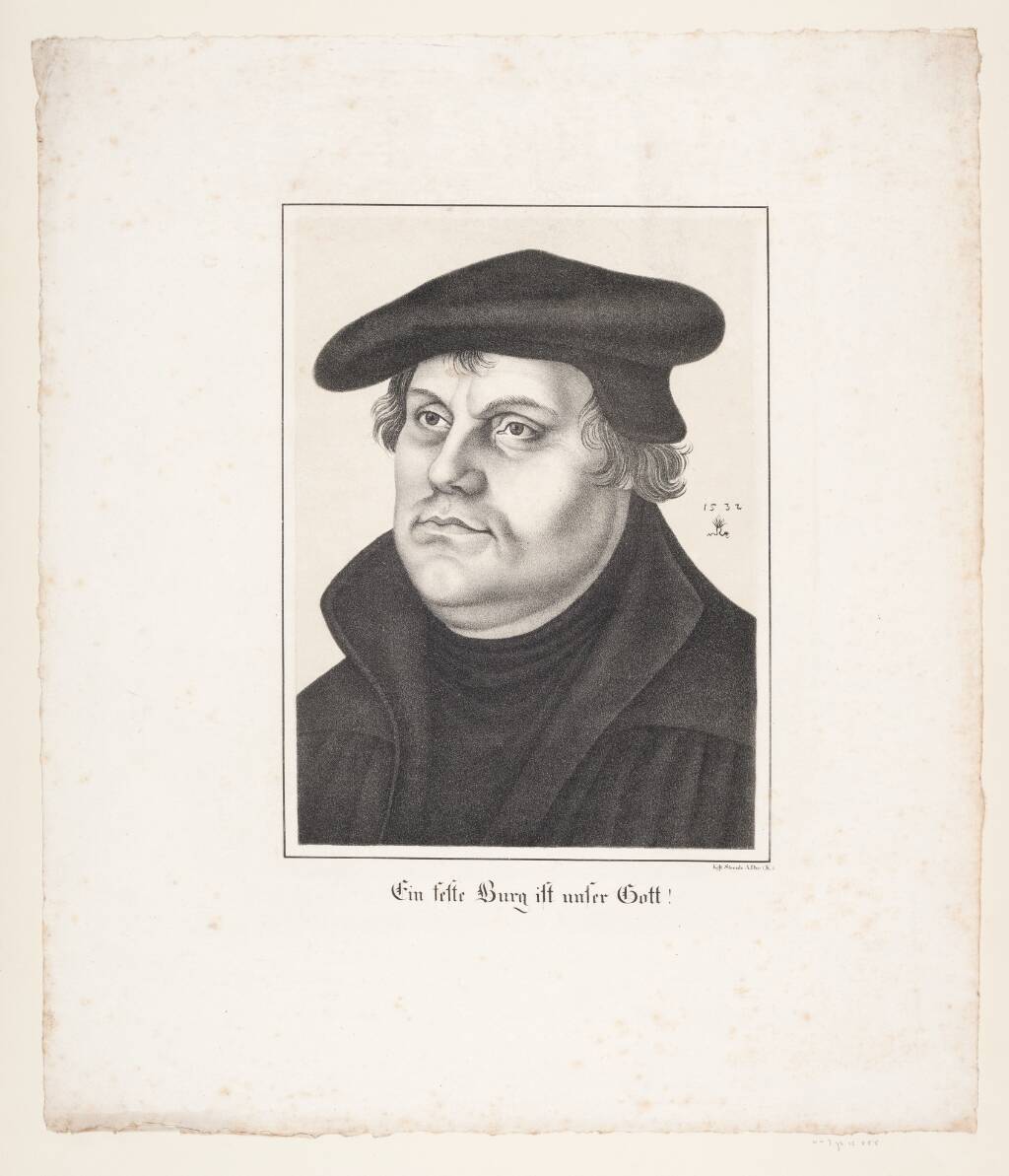 Portrait Martin Luther (c. 1810; L. E. Grimm after L. Cranach d. J., designated 1560). Copper engraving, etching; 23 x 17.7 cm. Frontispiece in: Mathesius, John; Arnim, Achim of: Sermons... about the histories of the venerable, blessed in God, theurious m