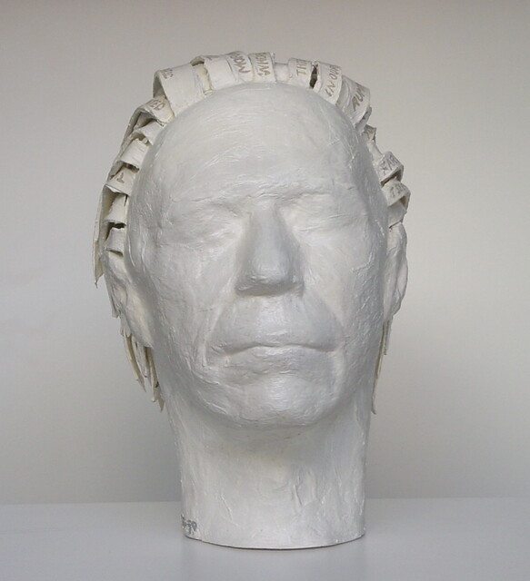 Instalación de pintura, cabeza tamaño real, pintura acrílica maciza con proyección, 30 × 24 × 24 cm.