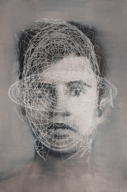 Laser engraved oil painting on paper, 45 × 30 cm.