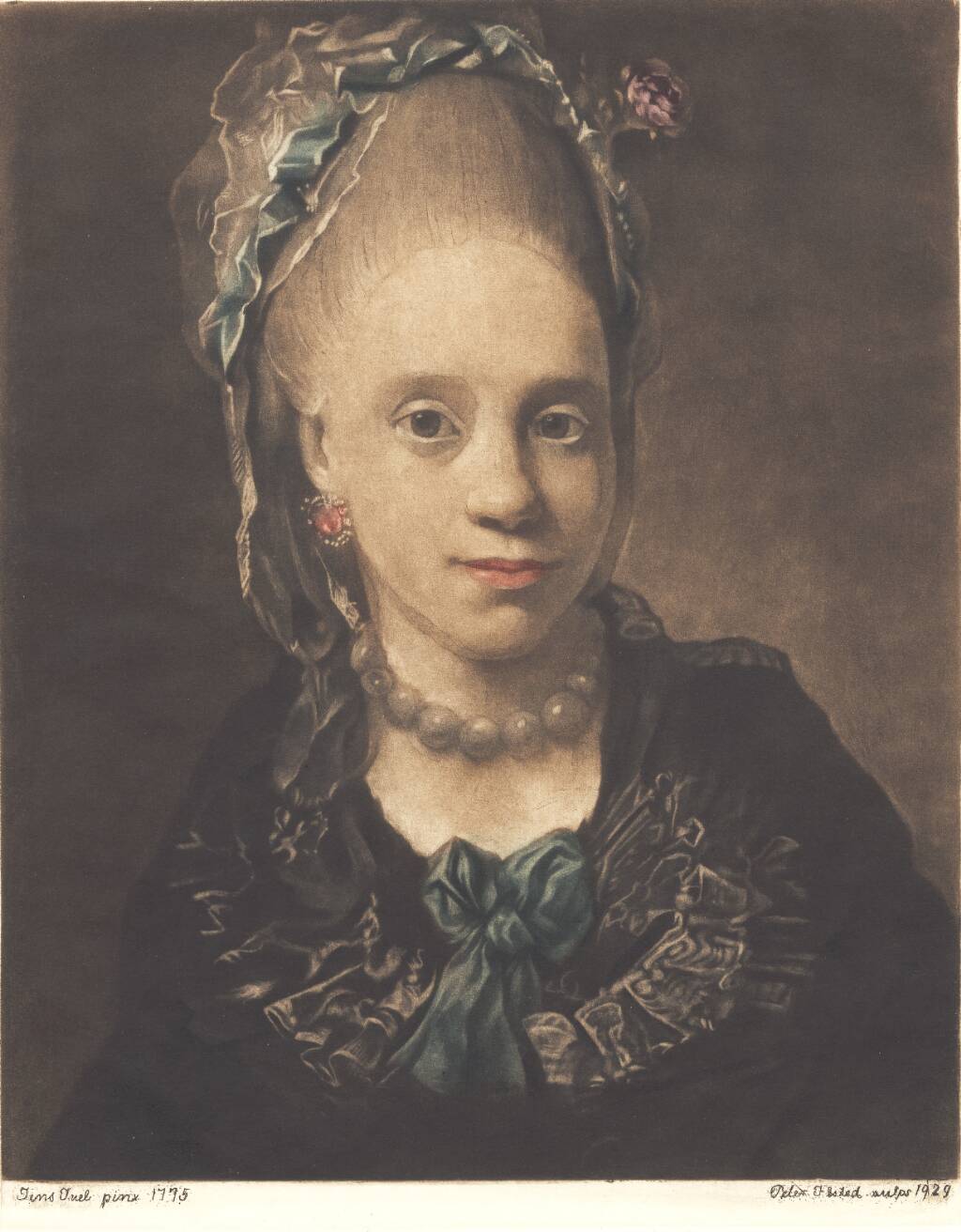 Dameportræt i medaljon. Profil t.v. Desuden to hoveder i profil