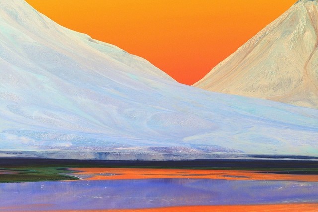 Painted in ink on paper by Arnold Chang (Zhang Hong; b. 1954), this hanging scroll represents a mountainous landscape with a lake, river, or other body of water in the immediate fo...