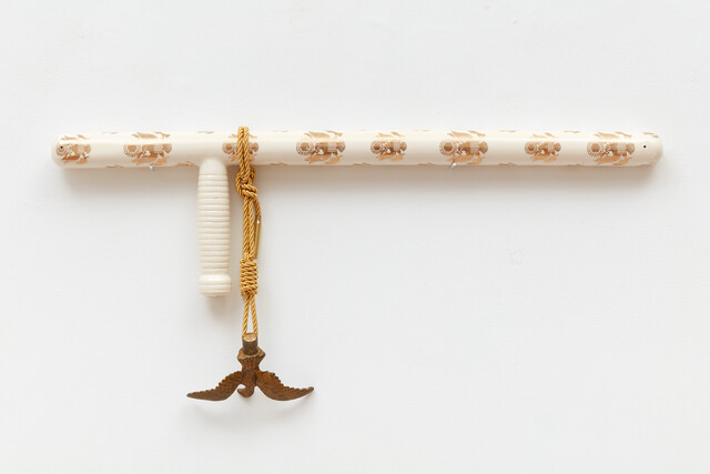 Glazed porcelain and tassel with bullet shell casings and cast-iron eagle finial, 7 × 25 × 1 1/2 in.