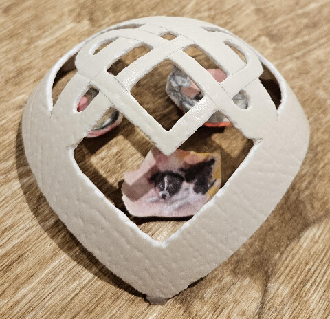 Hand-carved ostrich eggshell with painted chicken eggshells, 2 1/2 × 4 in.